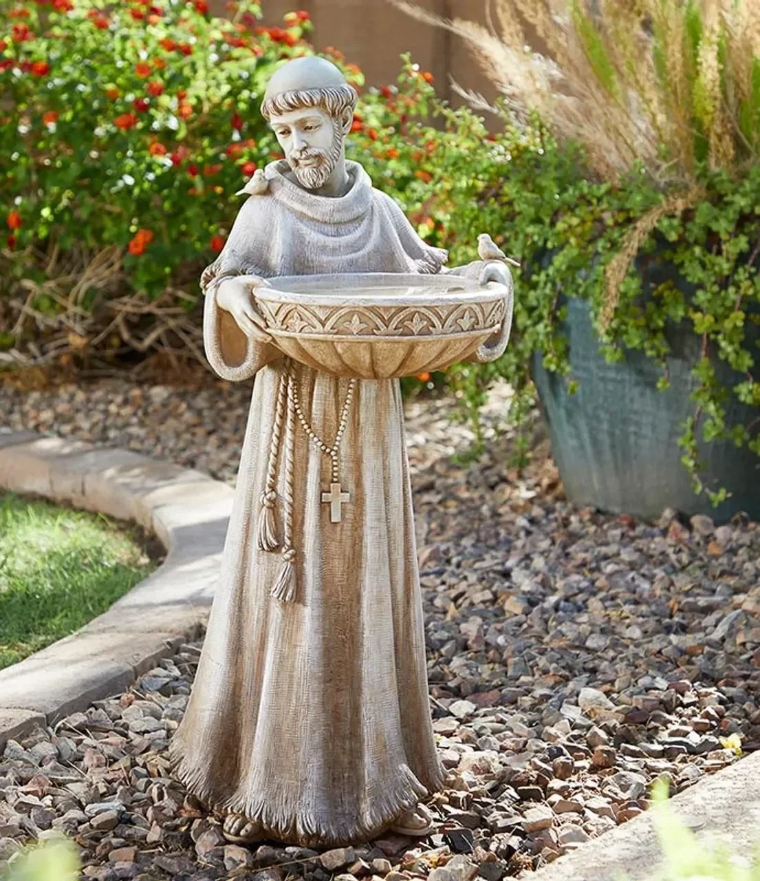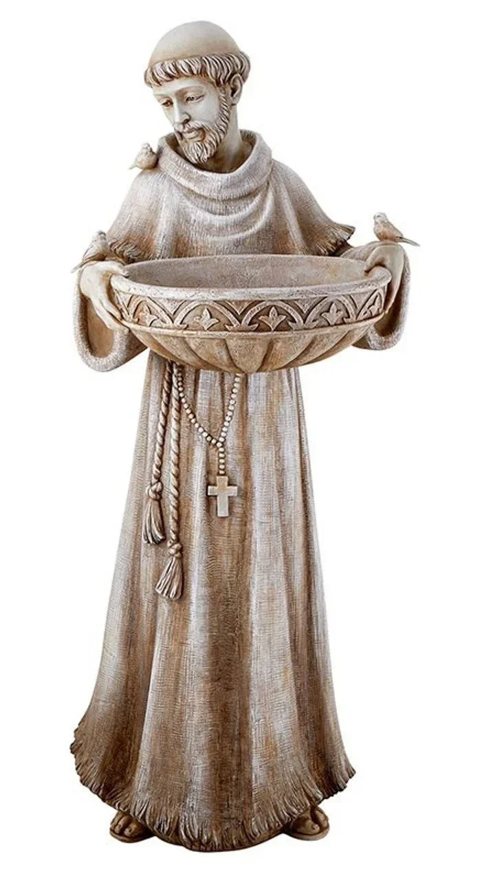 Saint Francis was the ultimate environmentalist Ideal for sun or shade, this elegant yet durable piece features a natural stone finish and will be treasured for years to come Fill it with water or bird feed to enjoy God's creatures Comes boxed for easy storage or gifting.